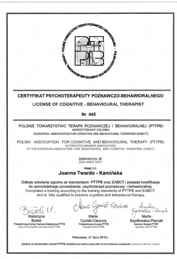 Trafiłam do Pani Joanny w ciężkim stanie depresyjnym, cierpiałam na silne stany lękowe, borykałam się z myślami samobójczymi i dewaluacją. Natychmiast poczułam niesamowitą empatię i czułość ze strony Pani Joanny, rozmowa z nią przynosiła mi ulgę, dzięki zrozumieniu jakie z jej strony otrzymałam. Rozmowa płynie bardzo naturalnie, w dobrej atmosferze, dodam, że sam głos Pani Joanny brzmi wręcz kojąco. Opiekuje się pacjentem, rozmawia rzeczowo, bazuje na przykładach, niejednokrotnie potrafi też troszkę rozluźnić rozmowę zabawną wypowiedzią, co tylko pogłębia więź na płaszczyźnie terapeutka - pacjent/ka. Jestem bardzo wdzięczna za pomoc jaką otrzymałam od Pani Joanny, cieszę się, że w końcu do niej trafiłam, bo kilka moich wcześniejszych wyborów terapeutycznych było mocno chybionych. Polecam z całego serca i zachęcam do spróbowania terapii właśnie z Panią Joanną, bo jest specjalistką w swoim fachu zarówno przez swoje doświadczenie i wykształcenie, jak również przez jej osobowość.